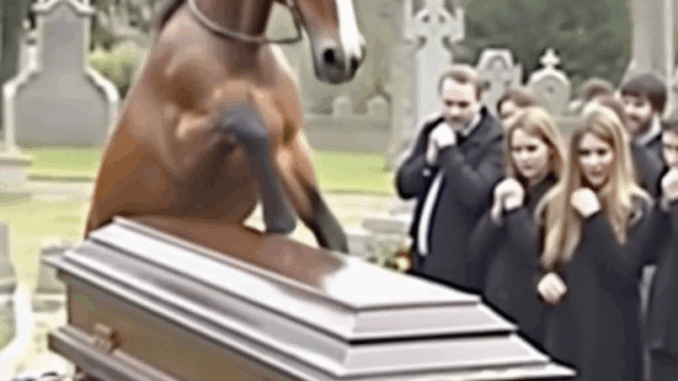 Ahora era una tempestad en plena furia, sus cascos golpeaban el suelo con un ritmo que resonaba por las calles estrechas y silenciosas. Su crin ondeaba hacia atrás como un estandarte, y sus ojos brillaban con algo que parecía casi un desafío. Al llegar al ataúd, la multitud se apartó como si una mano invisible la hubiera ordenado. No había forma de contenerla; era una fuerza de la naturaleza, imparable y resuelta.