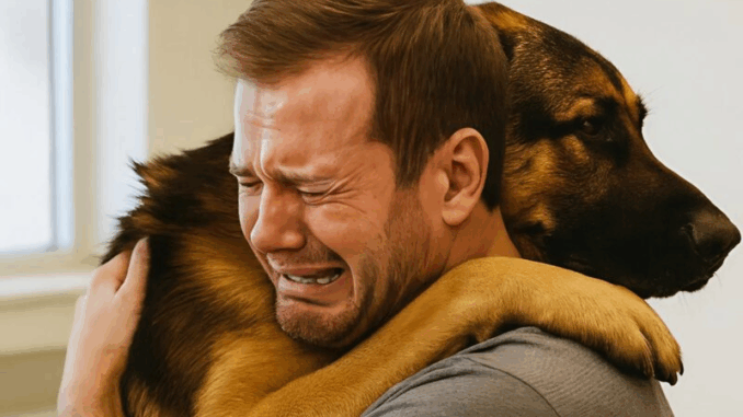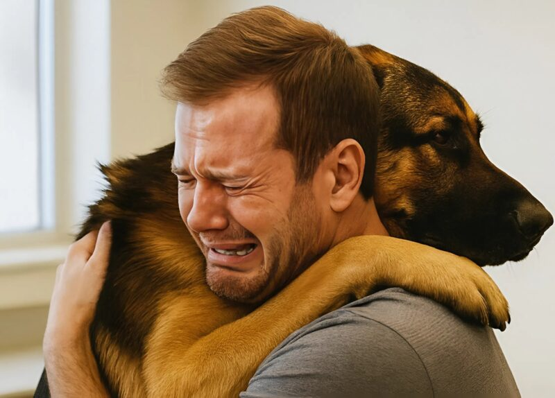 El perro, como si entendiera cada palabra, puso sus patas sobre los hombros de su dueño y se apretó contra él. El hombre lo abrazó con fuerza y ​​comenzó a llorar a gritos.
