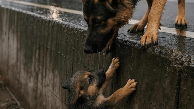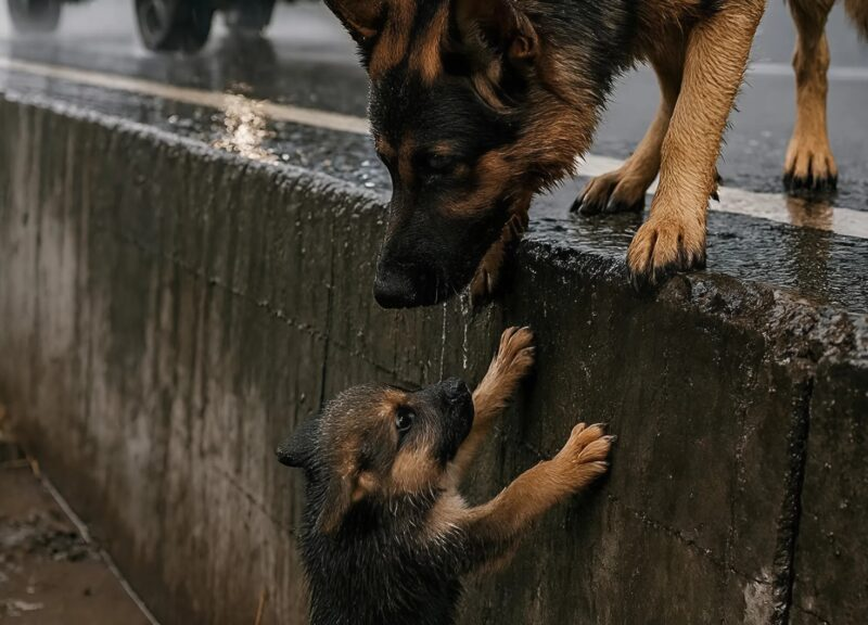 Entonces lo vi: abajo, cerca de un muro de hormigón, un cachorrito intentaba trepar con dificultad. Tenía la patita herida y no podía subir. Cuando la perra adulta me vio, su ladrido se convirtió de repente en un gemido lastimero, como si pidiera ayuda.