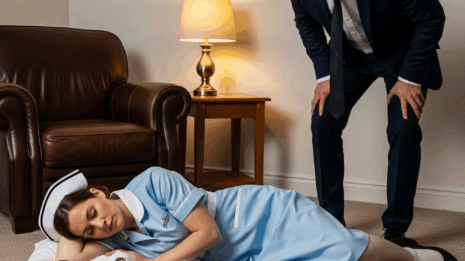 En el suelo, bajo la cálida luz de la lámpara, yacía una joven con un uniforme turquesa. Su cabeza reposaba sobre una toalla doblada, sus oscuras pestañas rozando sus mejillas mientras dormía profundamente. Acurrucados a su lado estaban sus dos hijos de seis meses —sus preciosos gemelos— envueltos en suaves mantas, con sus pequeños puños aferrados a sus brazos.