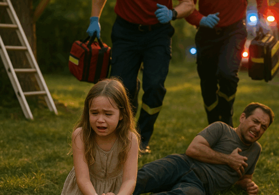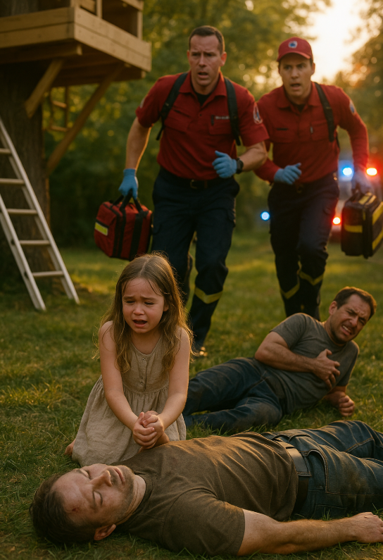 Se cayeron. No se mueven. Estábamos en el patio trasero, y papá dijo que le daríamos una sorpresa a mamá cuando volviera. Subió con el Sr. Parker para arreglar la cuerda de la casa del árbol. Entonces la escalera se resbaló. Se cayeron. Por favor… no se despiertan.