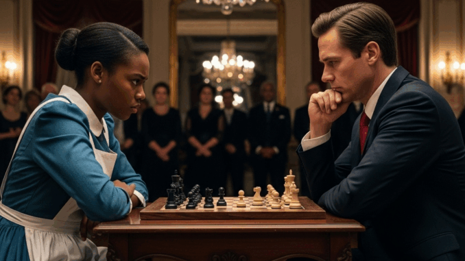 La partida había comenzado. Richard chasqueó los dedos, fingiendo calma. «Buena jugada para alguien que limpia baños», dijo, intentando recuperar la compostura, pero la tensión en el ambiente había cambiado. Los invitados, que antes se habían burlado, ahora observaban atentamente. Elena se ajustó su sencillo uniforme, respiró hondo y tocó la siguiente pieza. La movió con firmeza, sin vacilar. La sala quedó en silencio. Cada uno de sus movimientos parecía fríamente calculado. Richard realizó un movimiento agresivo, avanzando su reina.