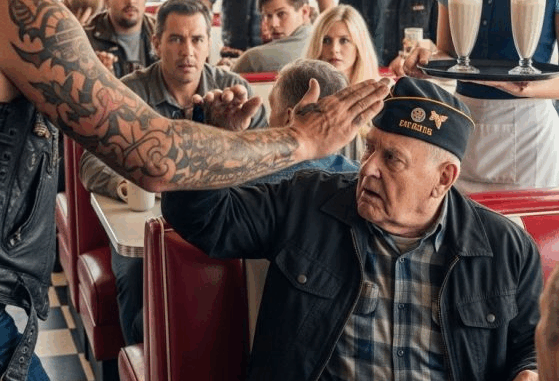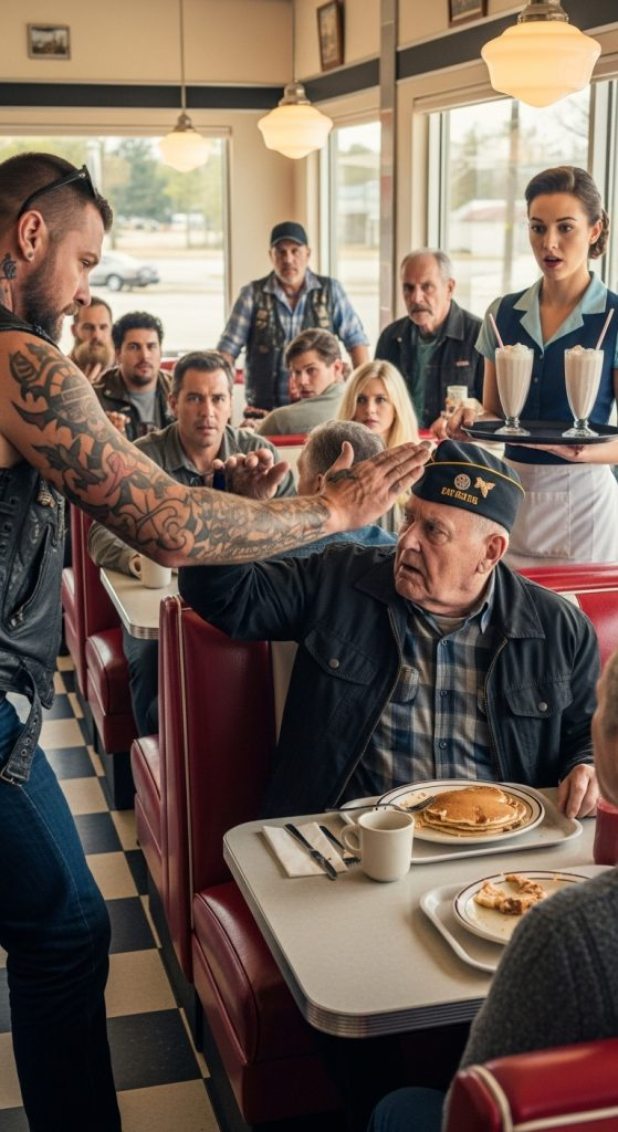 La respuesta, pronunciada con una serenidad inquebrantable, solo avivó la arrogancia del motociclista. Sin previo aviso, la mano de Cole voló por encima de la mesa, golpeando con fuerza a Harold en la mejilla. El sonido de la bofetada resonó en el restaurante. La gorra de Harold cayó al suelo y su café se derramó sobre la mesa. Una camarera jadeó y se tapó la boca con la mano, una madre protegió los ojos de su hijo, y la familia en la mesa guardó silencio. Cole rió entre dientes, orgulloso de su exhibición. “Deberías haber quedado en el pasado, soldado”, se burló.