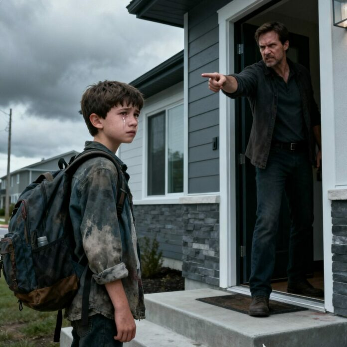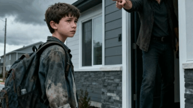 Mostraba a un niño de pie frente a una casa bajo la lluvia… una puerta cerrada frente a sus narices.
