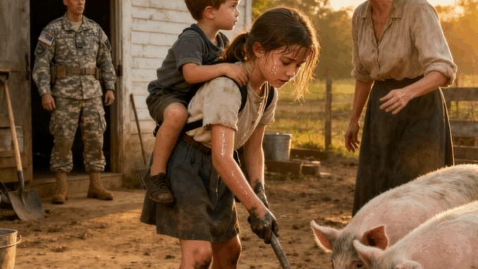 Emily, de tan solo nueve años, estaba dentro, intentando levantar un pesado cubo de heno mientras cargaba a Joshua, de tres, a la espalda. Tenía las manitas agrietadas y el suéter demasiado grande y sucio. Joshua se aferraba a ella como si tuviera miedo de soltarla. Max permanecía cerca, ladrando con fuerza como si los protegiera del mundo entero.