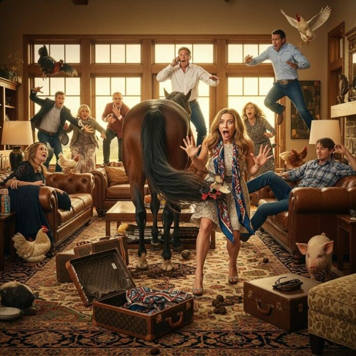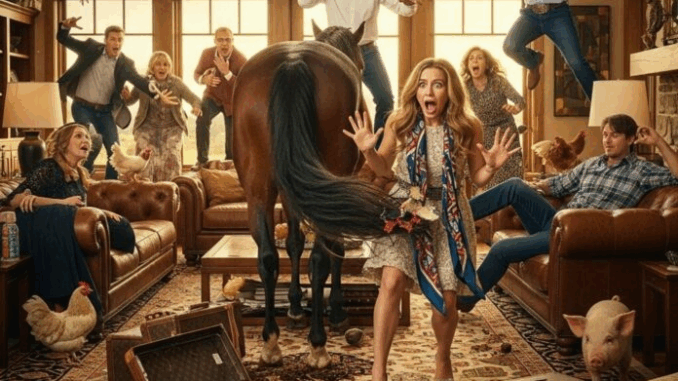 A través de la transmisión, Gail vio a Scout —su semental más viejo— erguido con orgullo en la entrada, con la cola ondeando como una bandera. Detrás de él, Bella había entrado en la cocina, mordisqueando con satisfacción la bufanda de diseño de Sabrina. Un trueno, siempre dramático, derribó un jarrón que había costado una fortuna.
