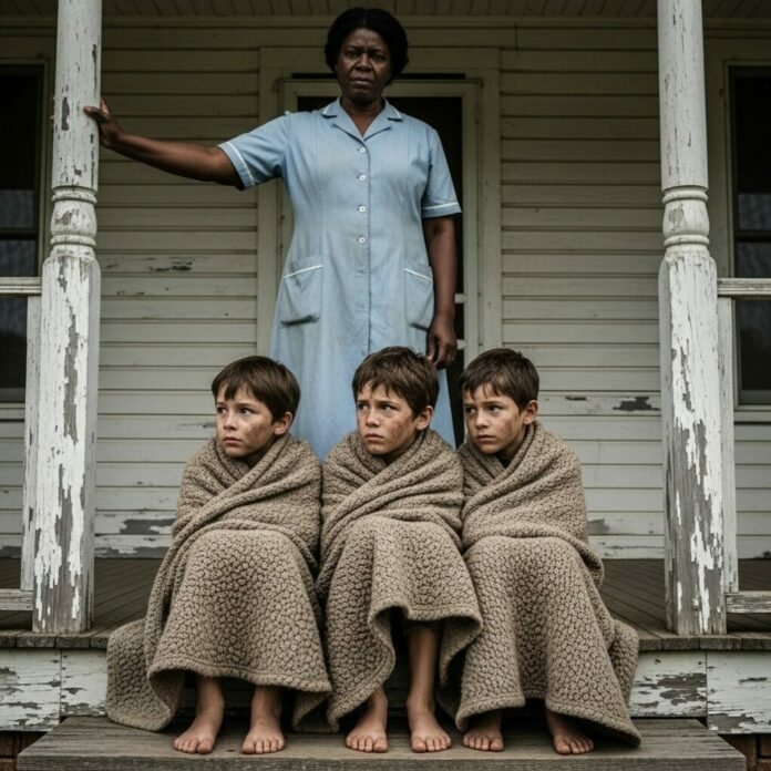 Una mañana lluviosa de octubre, Evelyn abrió la puerta mosquitera y encontró a tres niños acurrucados bajo una manta hecha jirones junto a los cubos de basura. Estaban empapados, descalzos y temblando. El mayor, Caleb, tenía unos once años; su diente roto y sus nudillos magullados eran prueba de tantas peleas. Drew, de unos nueve años, observaba todo con recelo. El pequeño, Jamie, de solo seis años, seguía chupándose el dedo y no había dicho ni una palabra.