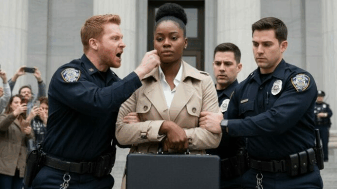 Dentro, los susurros llenaban la cámara. Los periodistas tomaban notas. Otros oficiales asentían a Peterson como si respaldaran su autoridad. Cassandra estaba sentada a la mesa del acusado, con las muñecas atadas, escuchando mientras Peterson inventaba su historia: era una “mujer sospechosa”, “que se resistía a las órdenes” e incluso “que amenazaba la seguridad pública”.