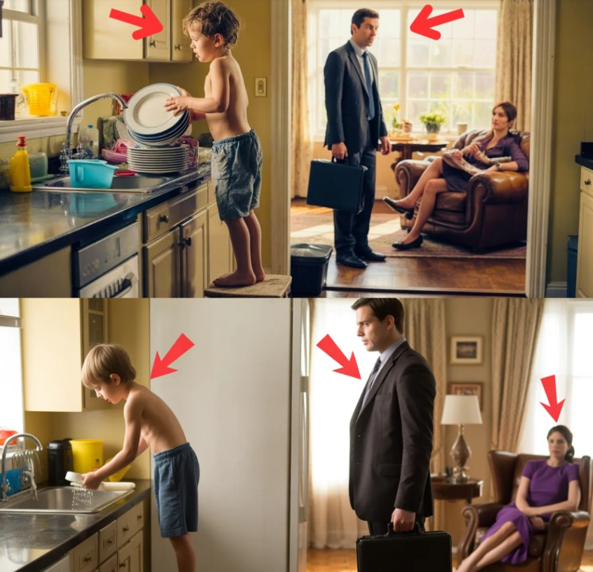 Sus pequeñas manos estaban rojas e hinchadas, con cortes visibles de platos rotos. Vestía ropa sucia y mojada, y tenía el pelo despeinado y pegajoso de sudor. A su alrededor había cubos, trapos y productos de limpieza, como si hubiera estado trabajando durante horas. El suelo de la cocina brillaba, recién fregado. Las encimeras estaban impecables.