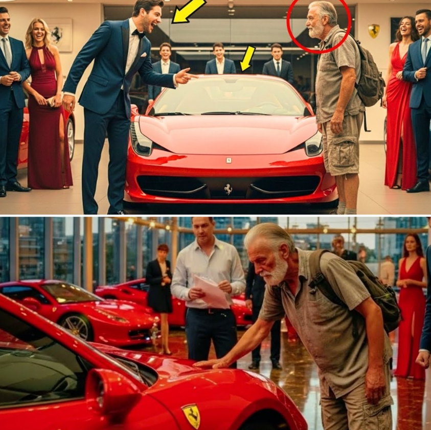 «Si puedes permitirte un Ferrari, te doy dos. Si puedes permitirte un Ferrari, te doy dos». El millonario se burló, su voz resonando en las paredes de cristal del concesionario. Siguió un coro de risas, como una orquesta de desprecio. De pie frente al reluciente coche rojo, un hombre mayor con sandalias y una mochila desgastada le sostuvo la mirada sin bajar la cabeza.