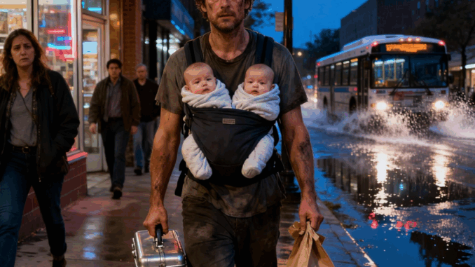 Las luces de la ciudad titilaban contra un cielo de noviembre descolorido mientras Daniel Brooks caminaba con dificultad por la acera agrietada, agarrando con una mano una caja de herramientas abollada y con la otra una fina bolsa de plástico del supermercado. Atados a su pecho estaban sus hijos gemelos, Matthew y Michael, de seis meses, suaves y dormidos, con sus cabecitas pegadas a su desteñida chaqueta de trabajo.