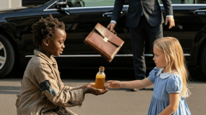 Al otro lado de la plaza, una chica de su edad estaba de pie. Su piel oscura brillaba de sudor, su ropa estaba rota y sucia, sus pies descalzos estaban cubiertos de polvo del pavimento. En sus manos, aferraba una pequeña botella de vidrio llena de un líquido espeso y dorado. A pesar de su pobreza, los ojos de la chica reflejaban determinación, como si custodiara un tesoro.