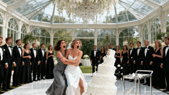 El sonido fue cataclísmico. La torre de siete pisos se tambaleó un segundo y luego se desplomó sobre el suelo de mármol. La porcelana se hizo añicos. Capas de bizcocho y crema estallaron, salpicando a los invitados de la primera fila. Pan de oro y glaseado blanco cubrieron mi vestido y el costoso esmoquin de David.