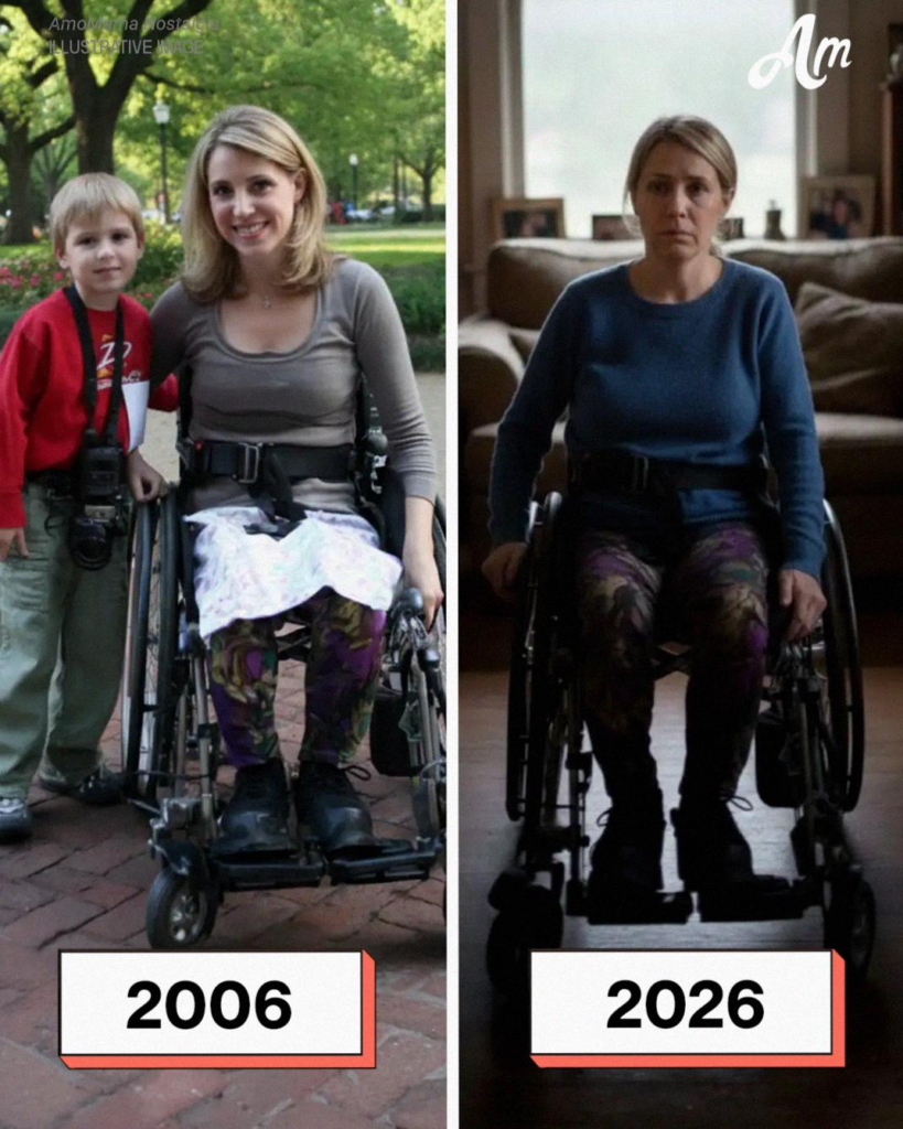 Debajo había una foto: yo, 20 años más joven, sentada en una silla de ruedas de hospital. Sosteniendo a Liam, de cinco años, en mi regazo.